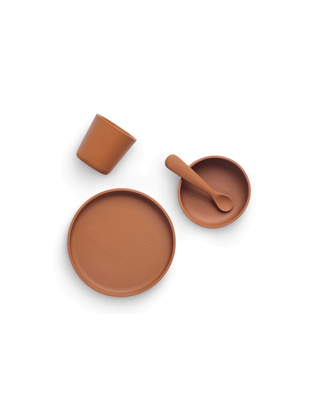 Cijeli dječji set posuđa sastoji se od tanjura, šalice, zdjele i žlice, a izrađen je od 100% silikona. 100% bez BPA, PVC-a i FTALATA