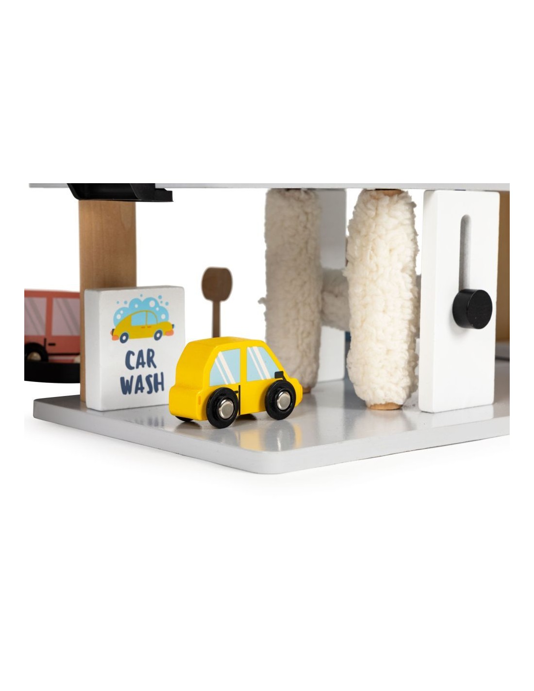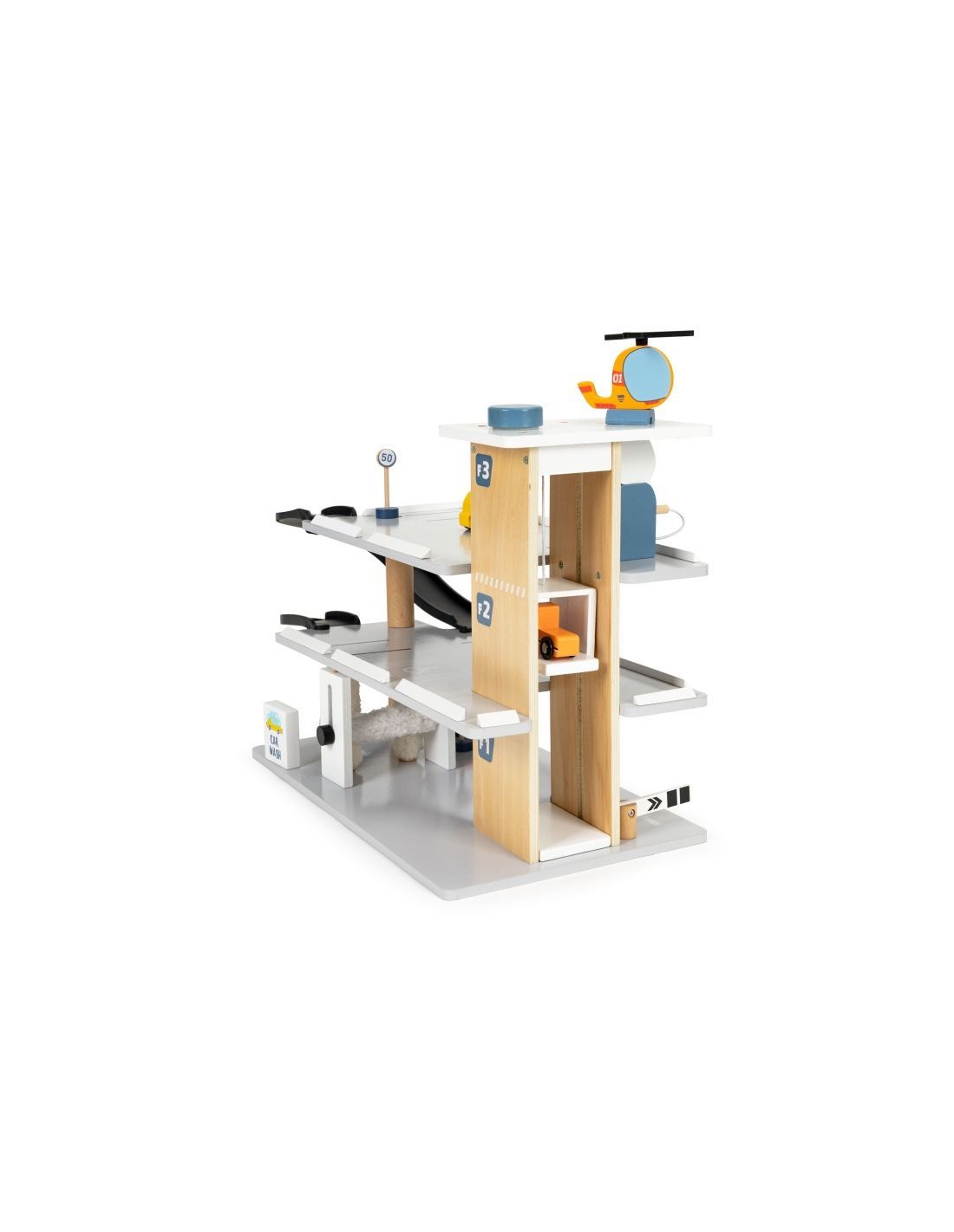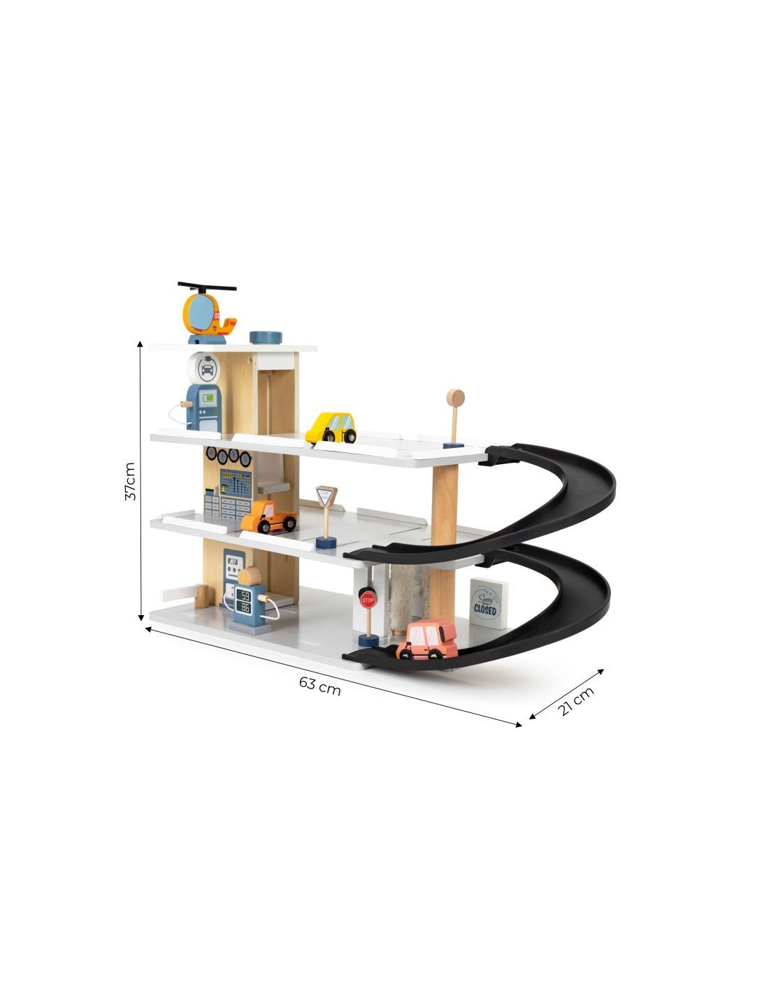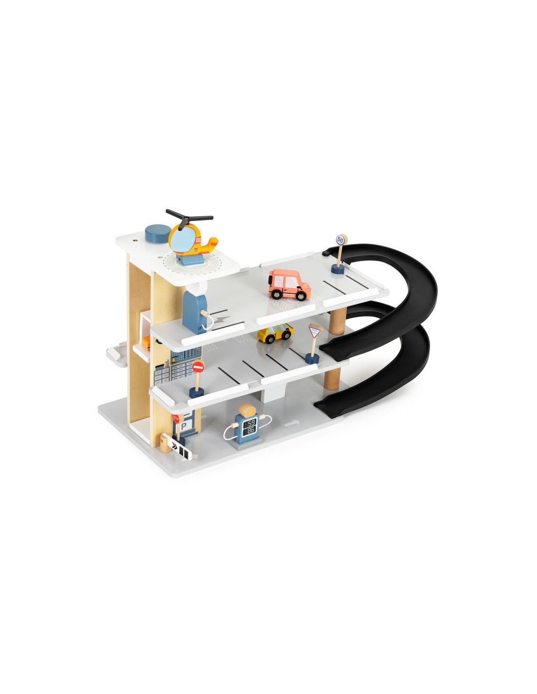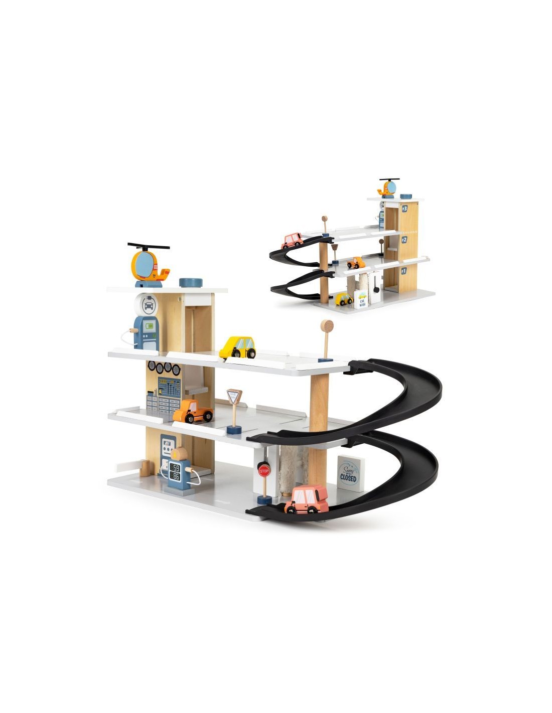 Velika drvena garaža za djecu s automobilima, helikopterom i prometnim znakovima.