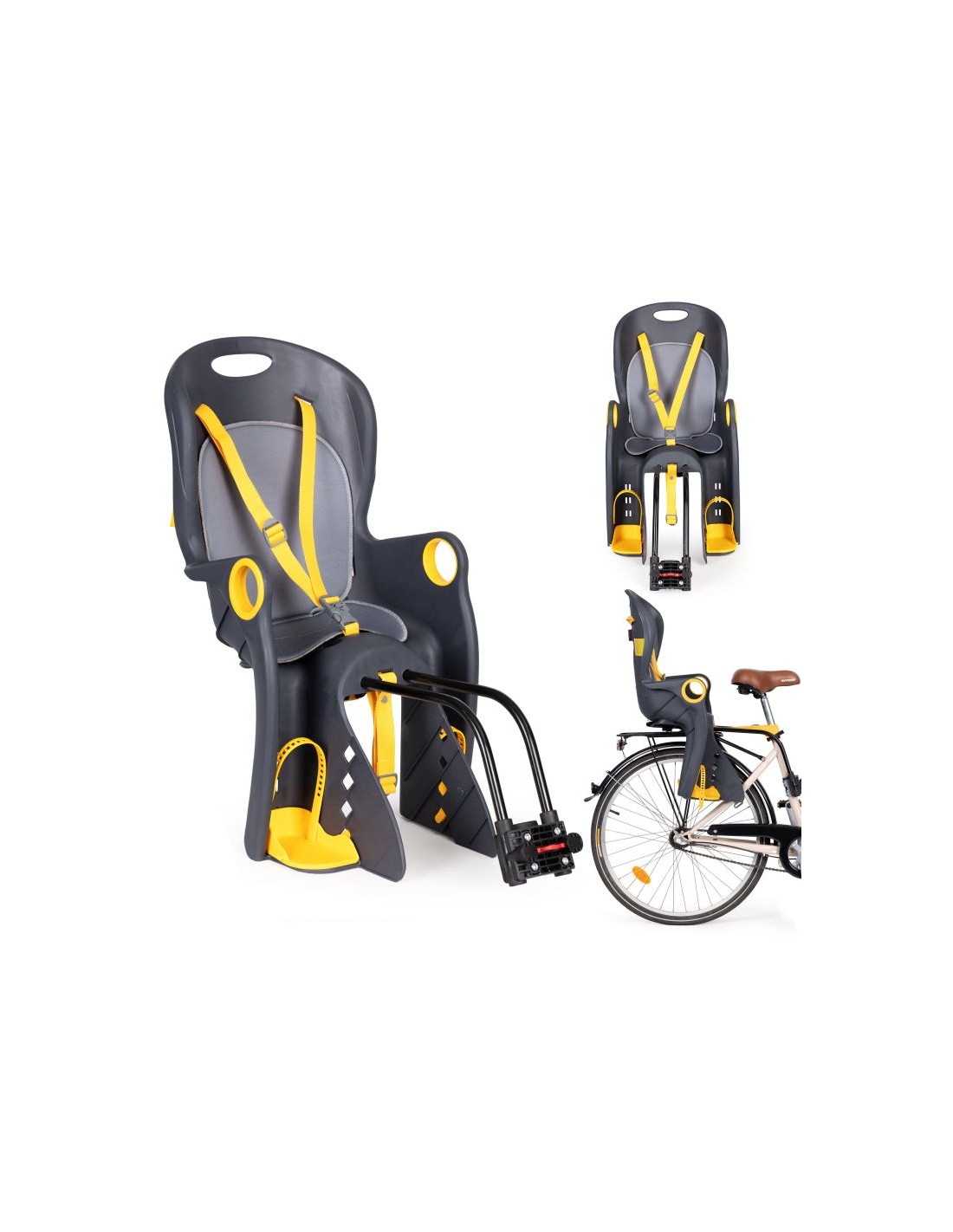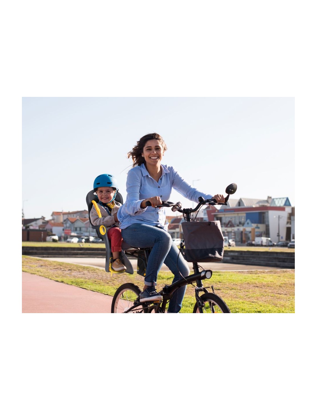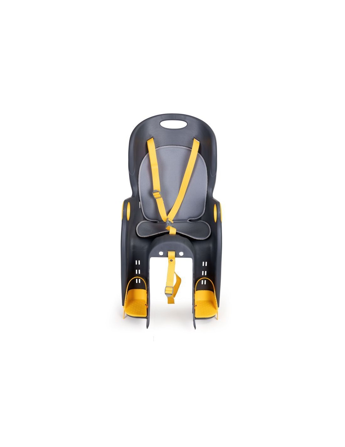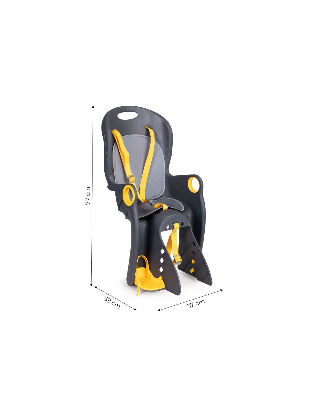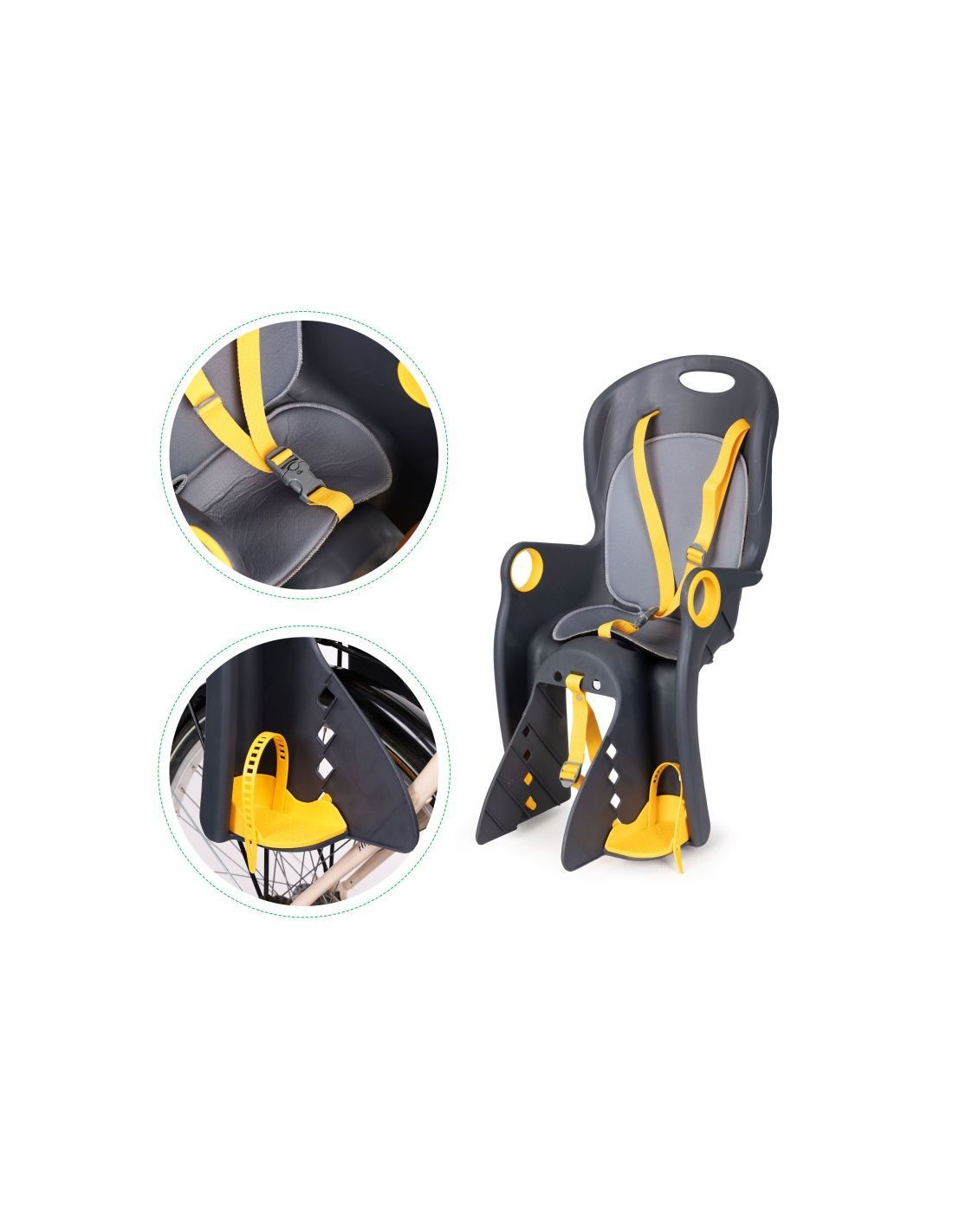 Dječje sjedalo za bicikl opremljeno je sigurnosnim pojasevima u 3 točke i mekanom udobnom podstavom.