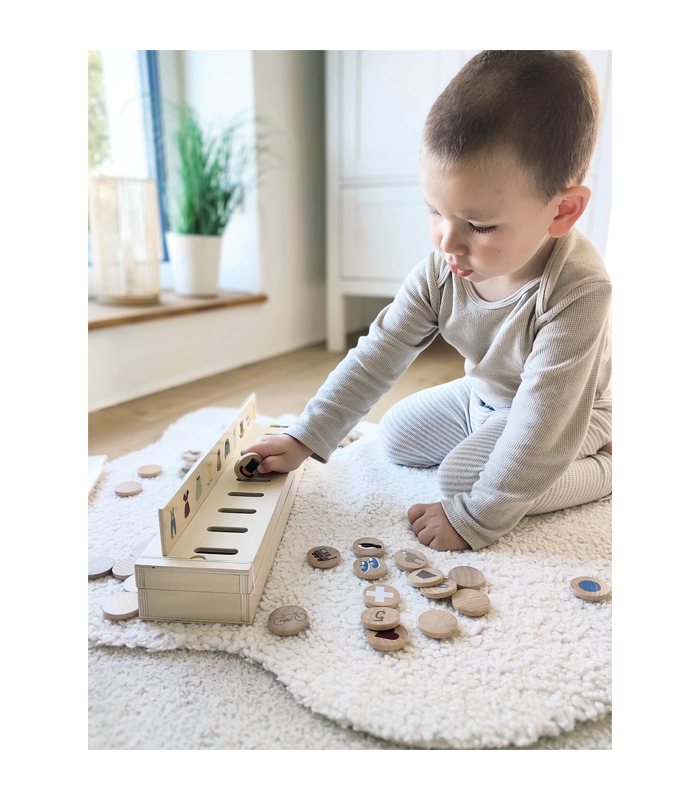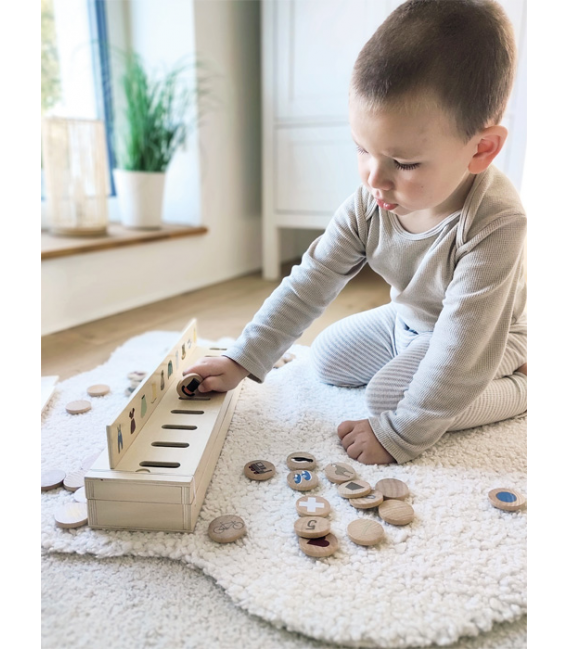 Prepoznavanjem, sortiranjem i umetanjem pločica djeca vježbaju finu motoriku te prepoznavanje boja i oblika.