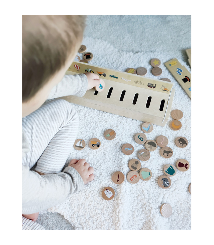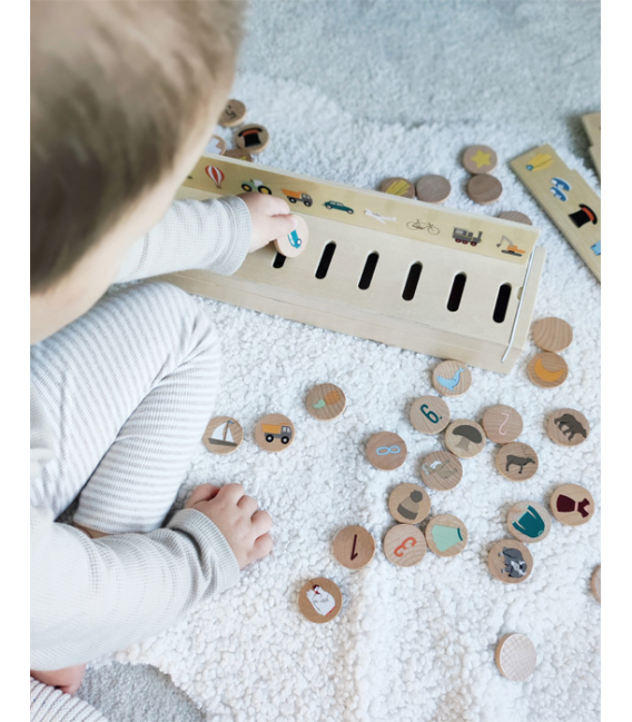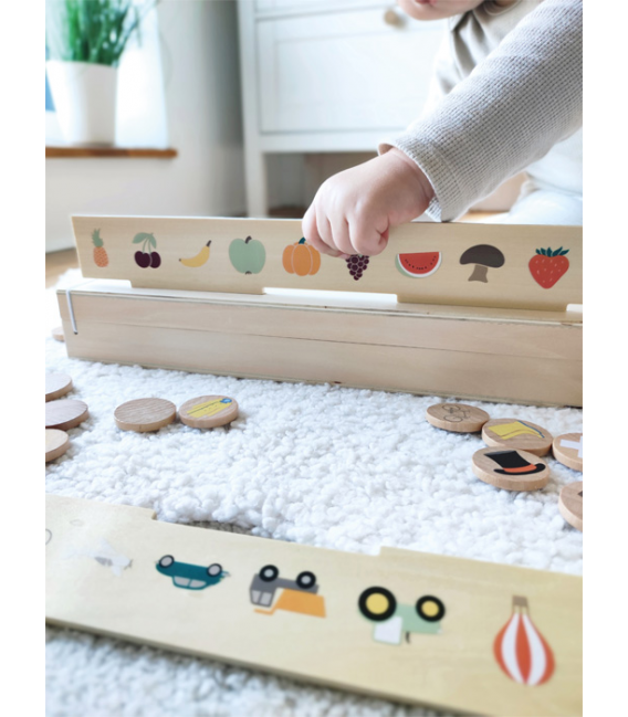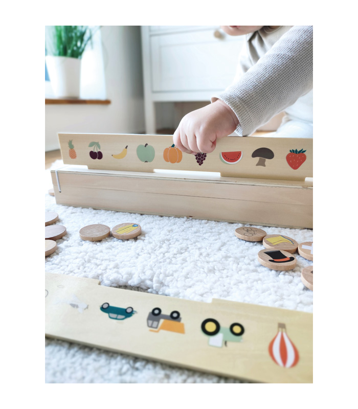Ova visokokvalitetna drvena kutija za razvrstavanje slika nudi mnoštvo motiva za otkrivanje s tri dvostrane ploče za umetanje i 60 pločica sa slikama na teme mobilnosti, životinja, brojeva, oblika, odjeće te voća i povrća.