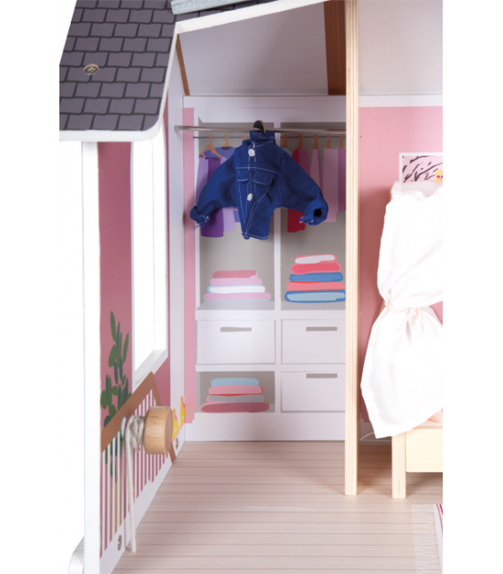 Pravi vrhunac za kreativno igranje uloga je garderoba u potkrovlju s walk-in ormarom, vješalicom za odjeću i 5 vješalica za odjeću za lutke u mjerilu 1:6.